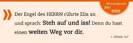 und wieder entsteht ein Gemeindebrief. Einen Teil Normalität versuchen wir zu erhalten, wenn wir auch keine Termine veröffentlichen. Und für diese Andacht stehe ich vor der Frage, welchen Vers ich als Grundlage nehme – den Monatsspruch aus dem Juni oder aus dem Juli. Schön wäre der für Juni ja auch gewesen. Aber der Monatsspruch für Juli! Er stammt aus dem 1. Buch der Könige, im 19. Kapitel, der Eliageschichte. Und gerade habe ich am vergangenen Sonntag über Elia und andere Geschichten gepredigt, in denen 40 Tage eine Rolle spielen! So fiel die Wahl dann auf Elia. Und der Engel des HERRN kam zum zweiten Mal wieder und rührte ihn an und sprach: Steh auf und iss! Denn du hast einen weiten Weg vor dir, heißt es im 7. Vers. Erstaunlich! Vor deutlich über einem Jahr wurden diese Verse ausgewählt! – Jeweils aus den laufenden Leseabschnitten der Ökumenischen Bibellese – ab 11. Juni wird das 1. Buch der Könige dran sein.